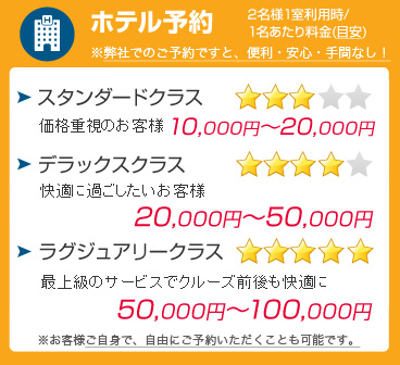 210,000円〜410,000円 全食事&全移動費無料 船内施設・イベント利用無料 |