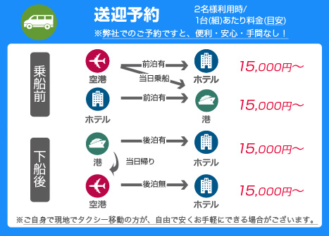 * 入港(到着日)は入港時間から下船まで約3-4時間かかりますので、航空券や新幹線や送迎などのお手配のお時間にお気を付けください。