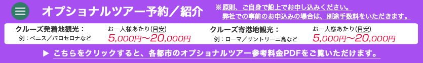 いくつかの船はクルーズ料金に含まれているものや、事前に支払う場合もあるので、予約の際にお問い合わせ下さい。